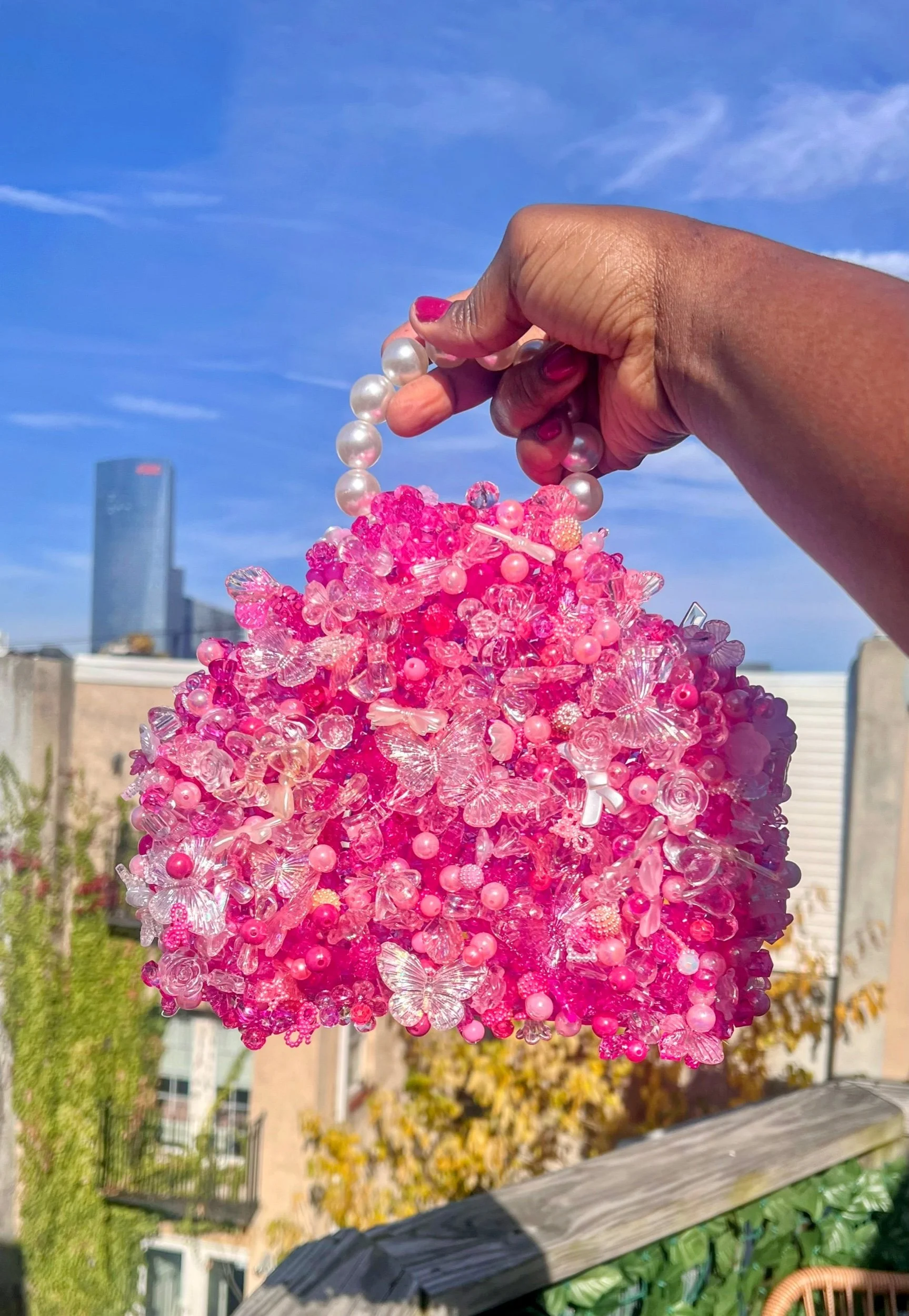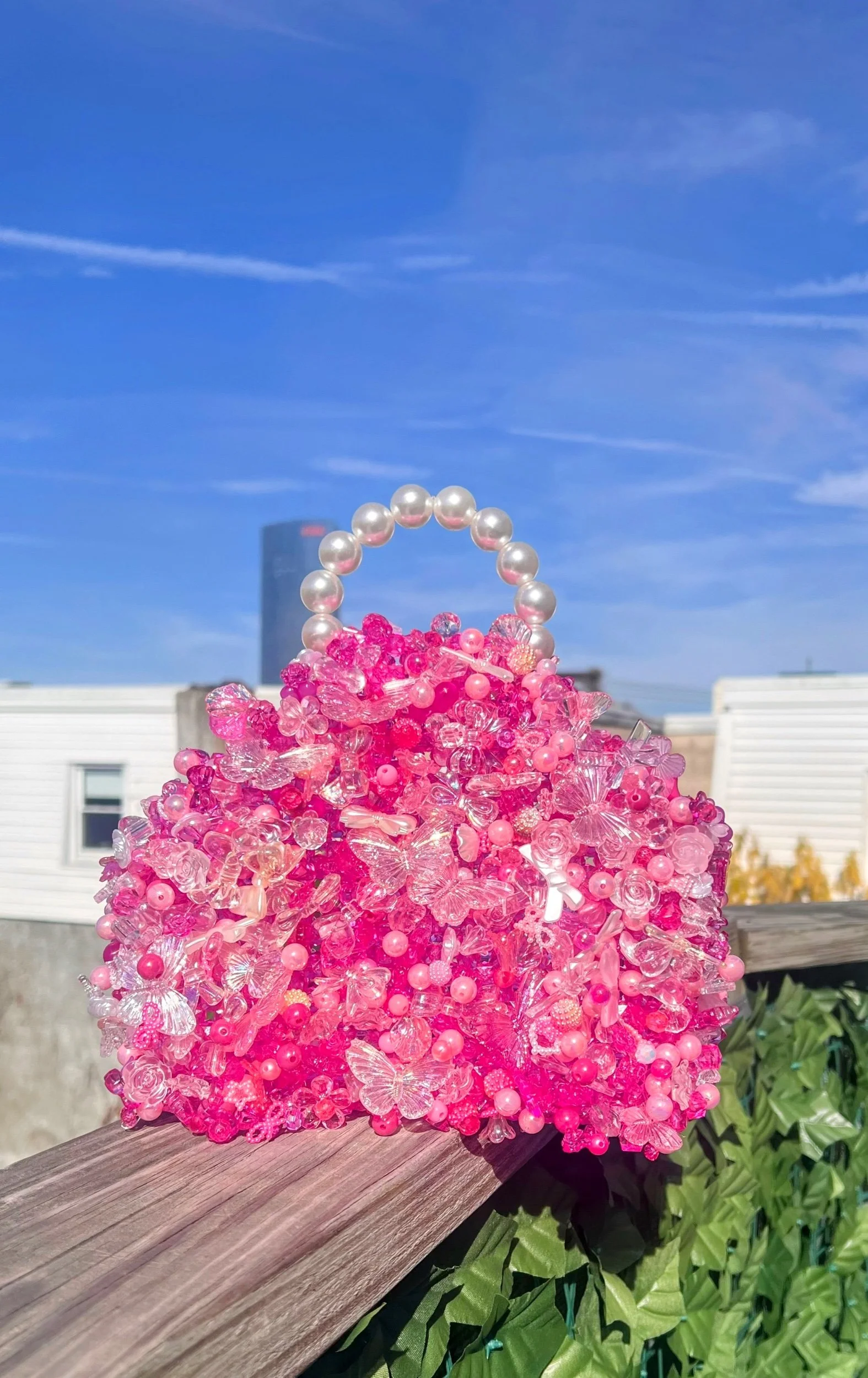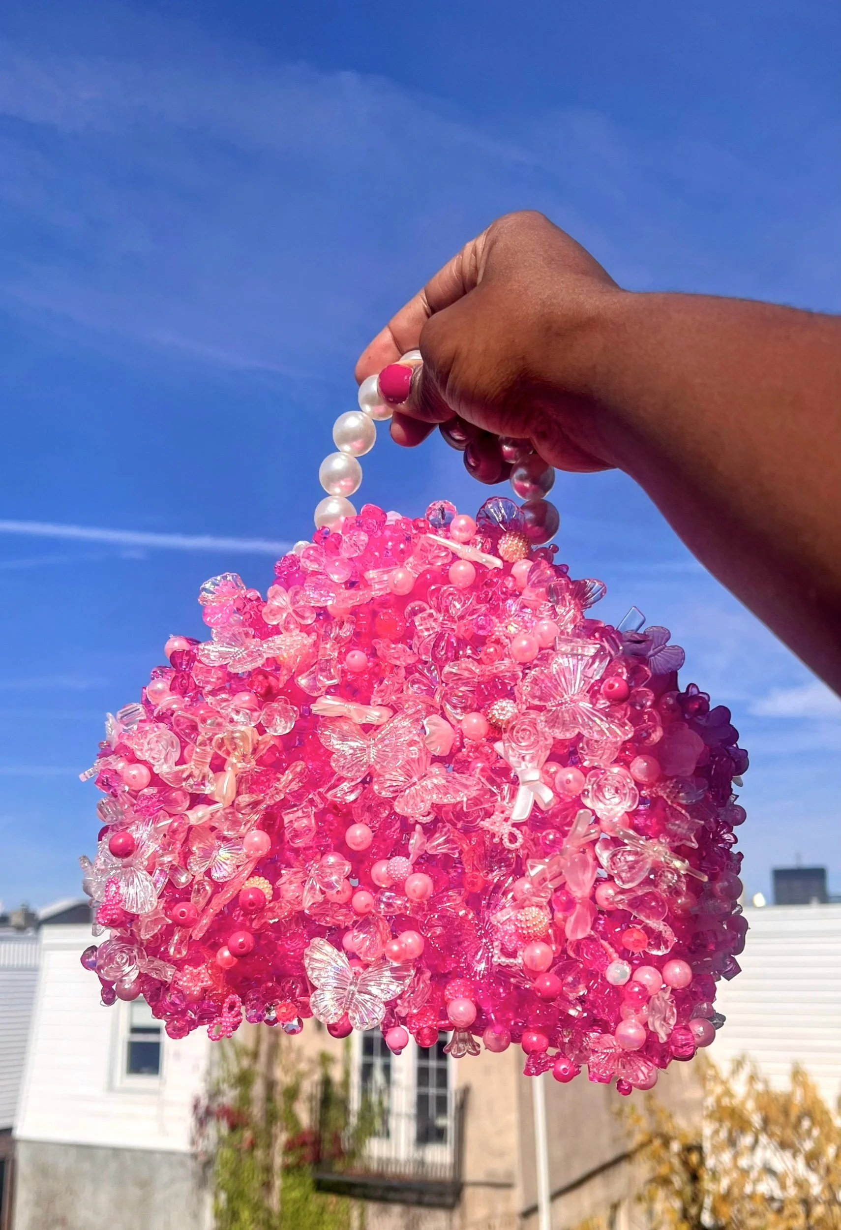 One of a kind and handcrafted from various styles of glass and acrylic beads, the Venus bag is an artistic creation stitched together in whimsy and style.